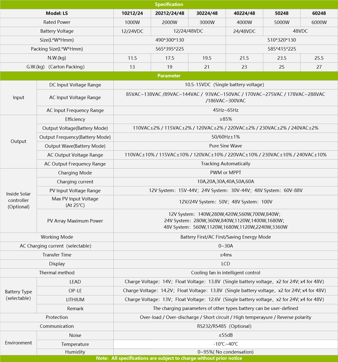 | Peso | 10 kg | Tipo di inverter | Inverter ibrido intelligente ad alta frequenza |