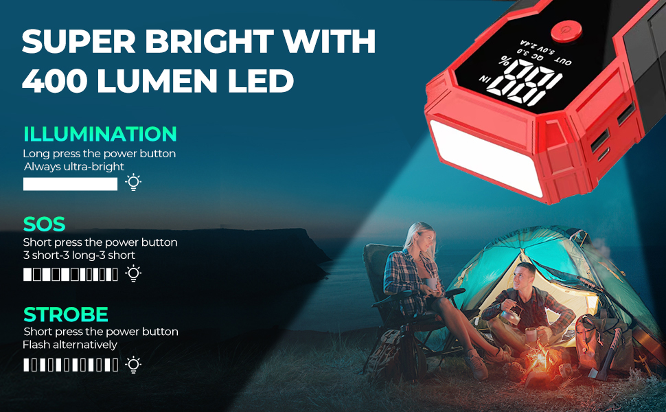 | Produção total | 37Wh | Função | Luz LED, à prova de faíscas, tela digital, carregamento rápido por USB, veículos Jump Start |