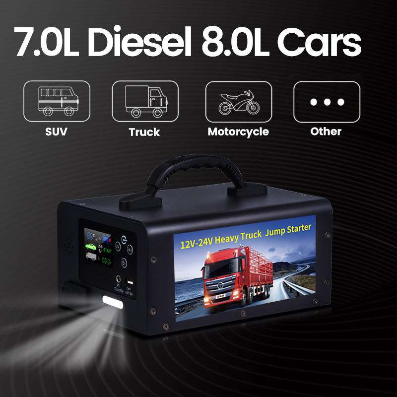 [ Усовершенствованный дизайн ] - Легко читаемый ЖК-экран поможет вам быть в курсе информации о состоянии аккумулятора; автоматическое распознавание режимов 12 В и 24 В, голосовое напоминание для удобства эксплуатации, оснащен светодиодной подсветкой 400 люмен, три режима: освещение, стробоскоп, SOS на ваш выбор; прочный и долговечный корпус с классом защиты IP65 делает портативное пусковое устройство водонепроницаемым, пыленепроницаемым и устойчивым к падениям.