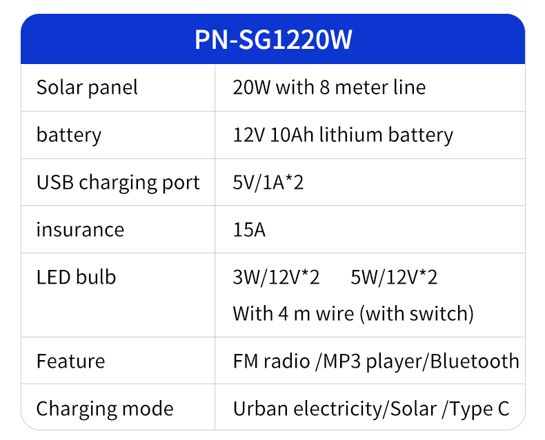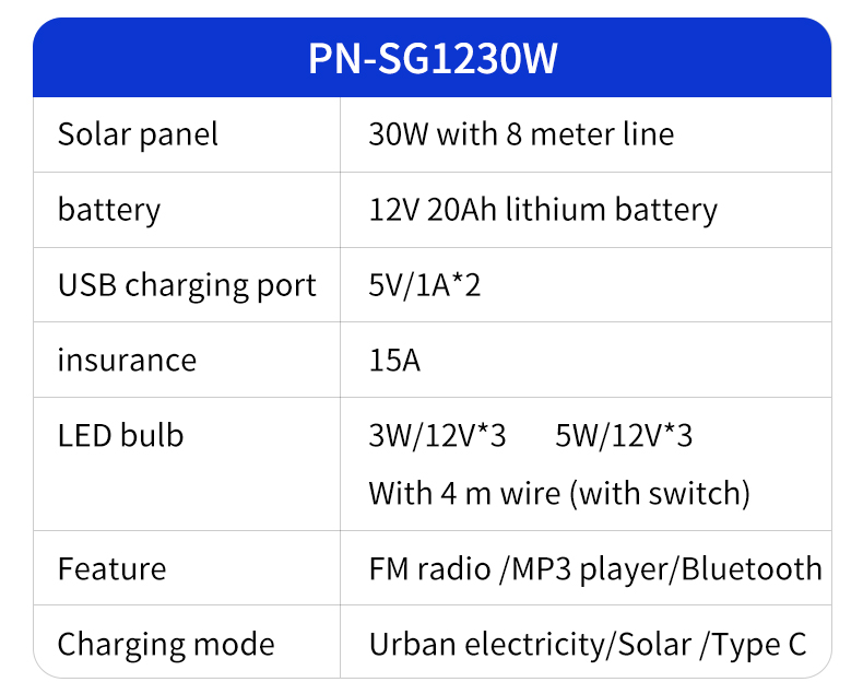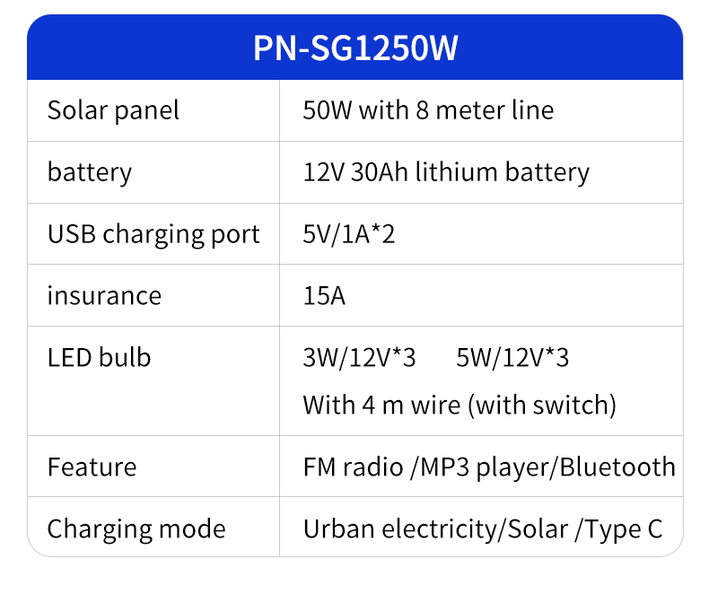 Модель №: PN-SG1250WСонячна панель 50 Вт + акумулятор 360 Вт*год + 4 світлодіодні лампи