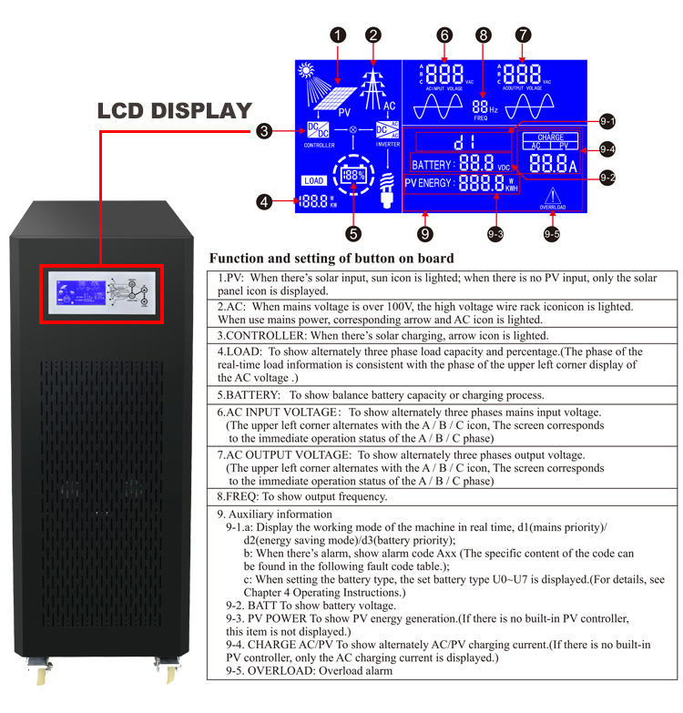 | Weight | Depend on the model | Inverter Type | Three Phase Inverter Charger / Hybrid Solar Inverter |