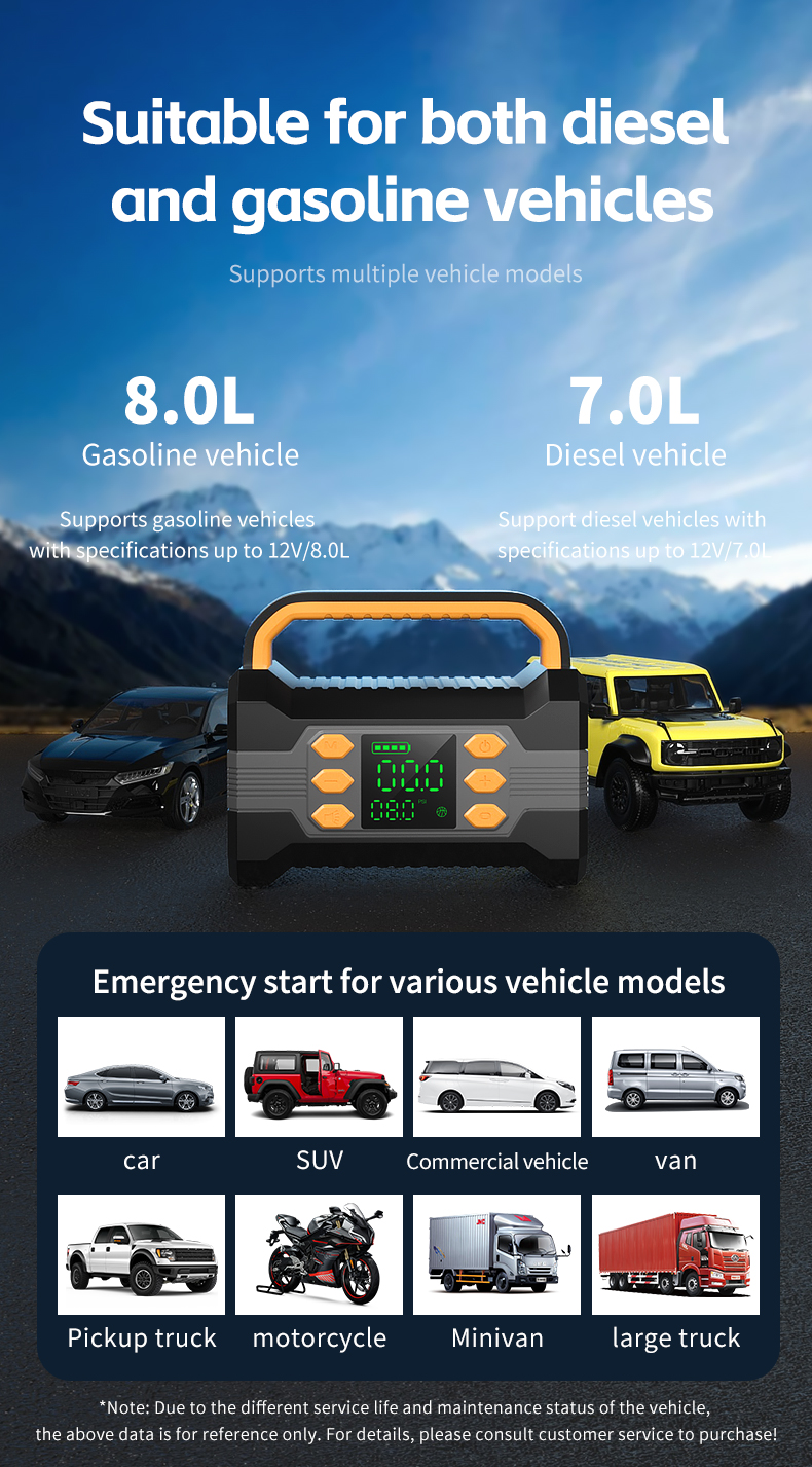 This multi-functional emergency device enables zero-voltage instant starts for large vehicles (up to 4.0L gas/3.0L diesel), features preset tire pressure monitoring for rapid inflation, integrates SOS lighting for roadside safety, and doubles as a 10,000mAh power bank for phones/tablets—all powered by a UL-certified polymer battery for reliable crisis response.