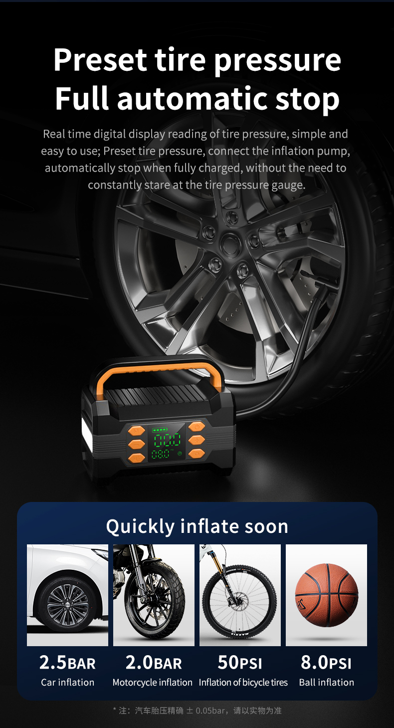 Real time digital display reading of tire pressure, simple andeasy to use; Preset tire pressure, connect the inflation pump,automatically stop when fully charged, without the need to constantly stare at the tire pressure gauge.